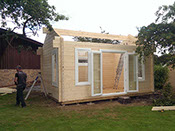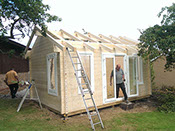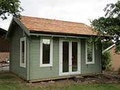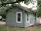 A cabin built for a customer in Sanction near York; this fully double glazed building is constructed with incredibly sturdy 90mm thick walls and finished in pale sage, highlighting it's beautiful cedar shingle roof.